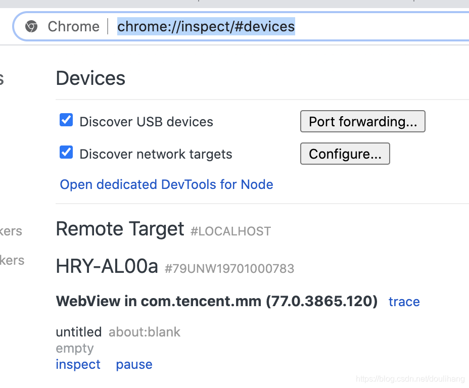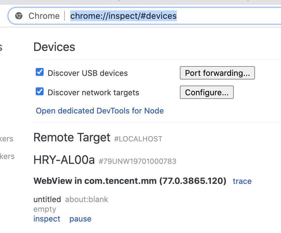 1)PC端打开谷歌浏览器,输入chrome://inspect/#devices,回车,出现如下画面,注意:此处需要电脑可以科学上网