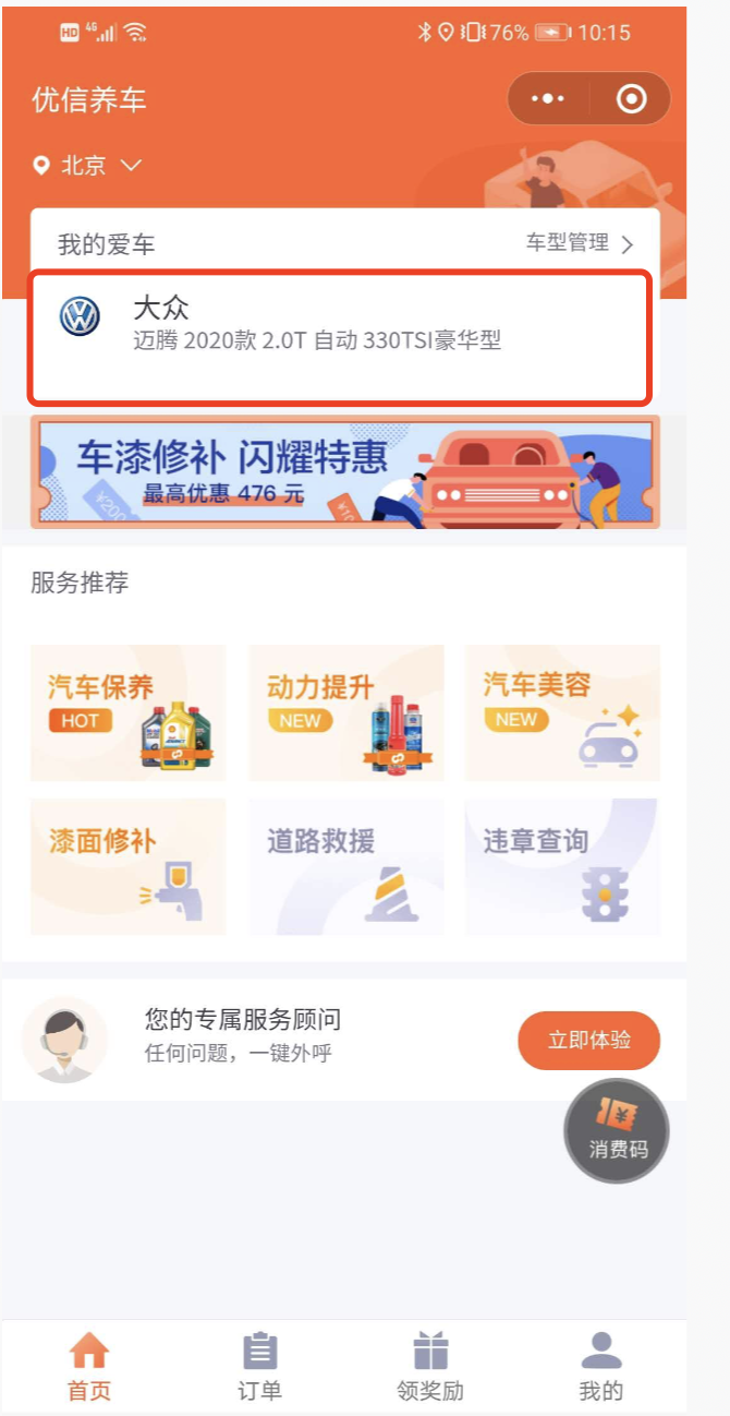 微信搜索小程序”优信养车“,绑定手机号,并选择一辆车。