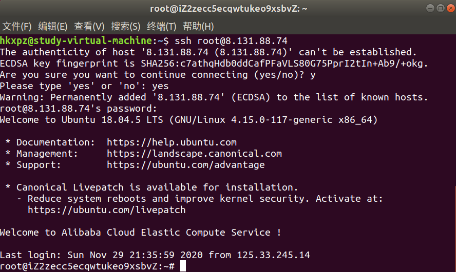 ssh 登录用户@服务器公网地址例如:ssh root@8.131.88.74
