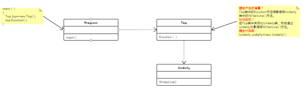 上图中的Top类与Underly类就属于强耦合关系,即当Underly类中的构造函数变更之后,如:更改为带参数的构造函数,Top类中的代码也需要跟着改变。