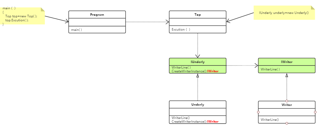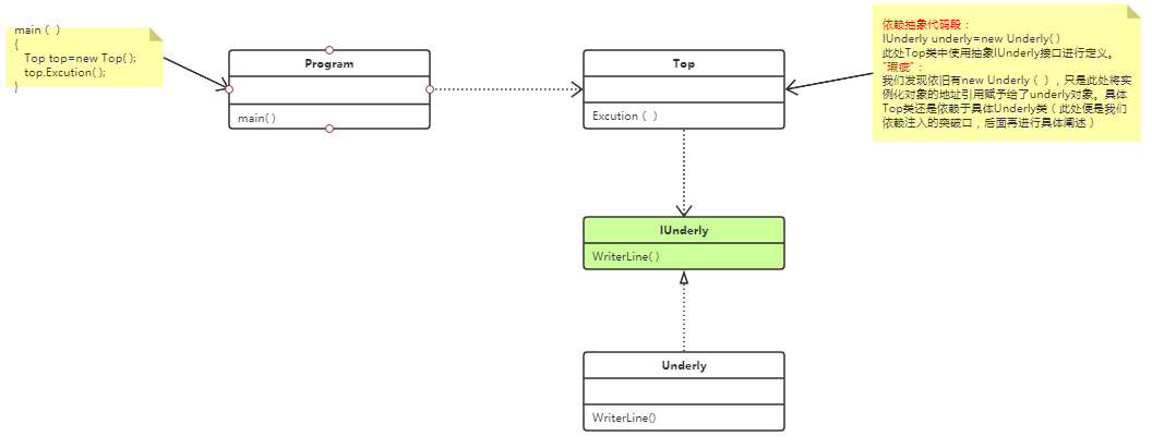 具体类中如果要依赖其他类,最好是依赖抽象。但在我们第二张图中我们遗留一个悬念:虽然Top类看似是依赖于IUnderly接口了,但在Top类的代码中依旧出现了具体类的实例化。这样就违背了“具体应该依赖于抽象”,Top类还是依赖了Underly类的构造函数,那要如何解决呢?