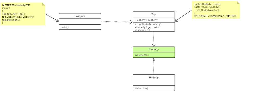 以我们上图中的Top类和Underly类来进行分析,针对Top类来讲它依赖Underly类,注入就是将Underly类注入到Top类中。