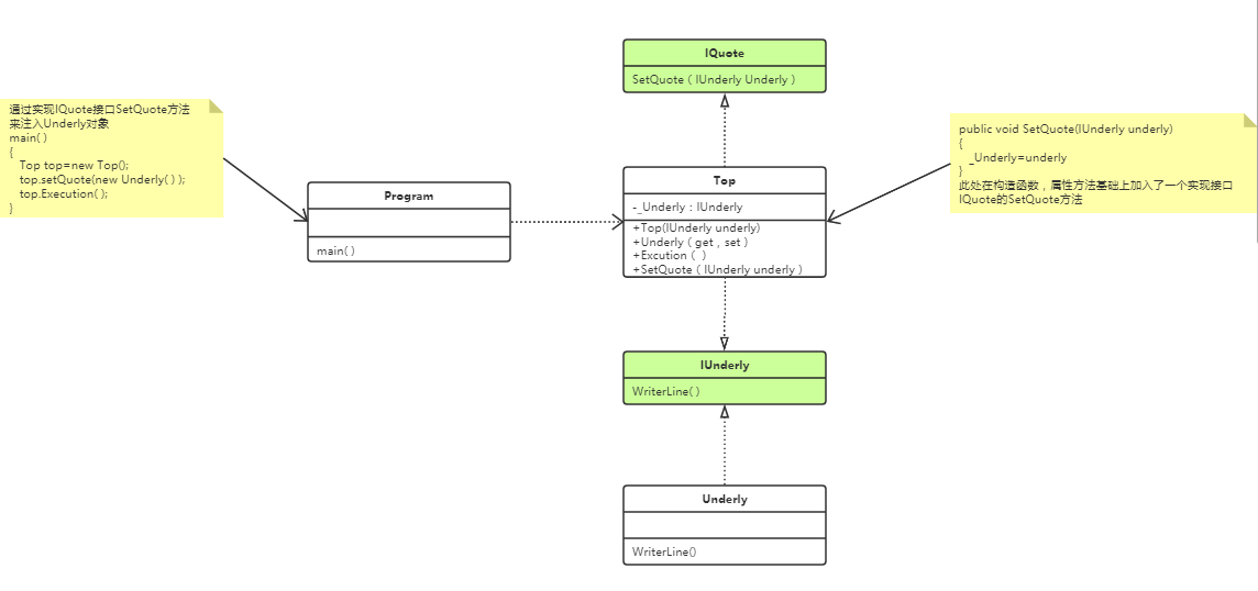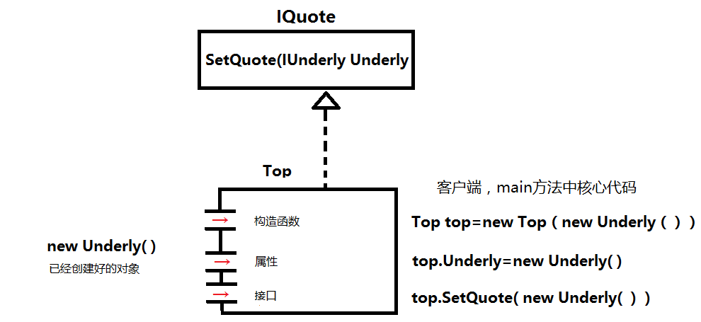 汇总:依赖注入就是将Top类依赖的Underly对象,通过Top的构造函数进行参数注入、通过Top的属性注入、通过Top实现的IQuote方法注入。