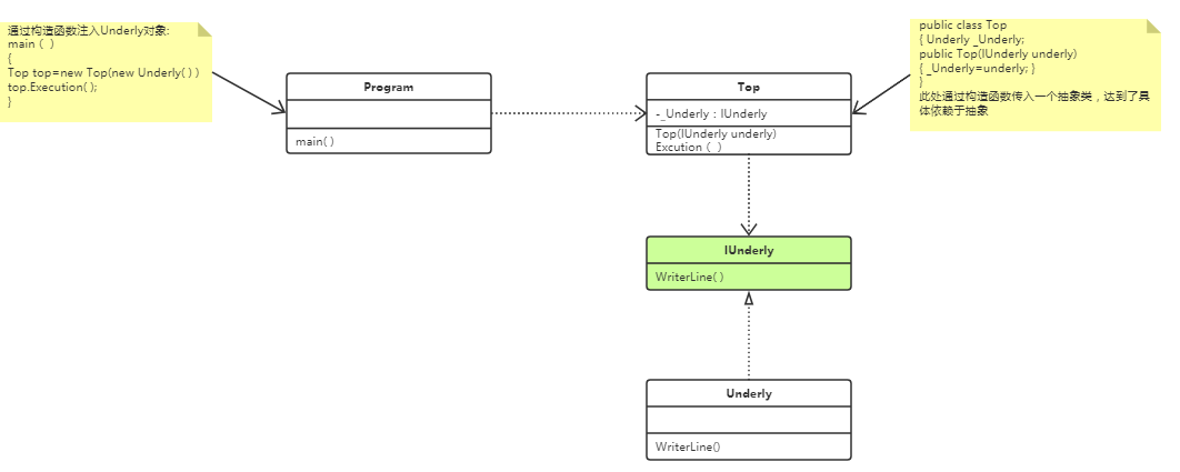 依赖倒置原则:高层模块(Top)不应该依赖于低层模块(Underly),他们都应该依赖于抽象(IUnderly)。