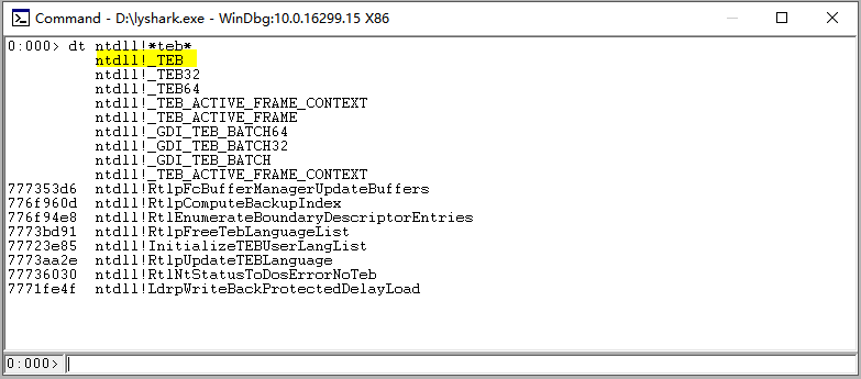 0:000> dd fs:[0x18] # 找到TEB基地址