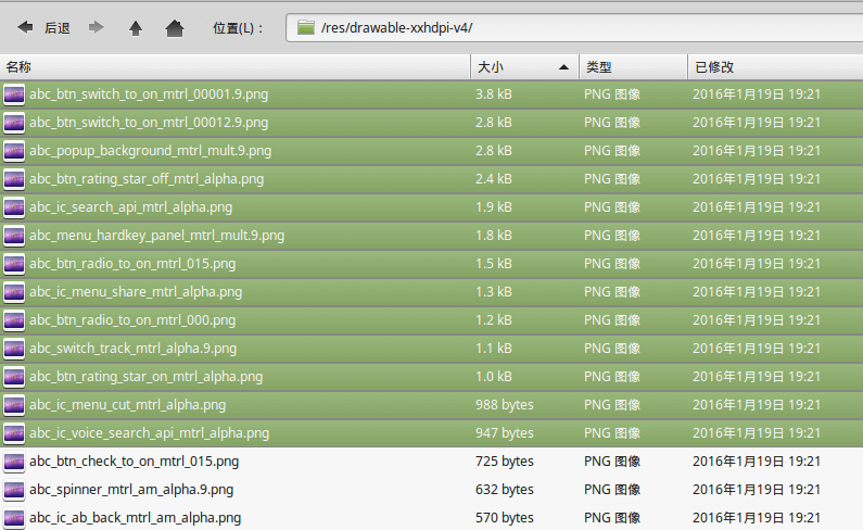 我没有把所有图都替换掉,只是把几张大一点点的图(选中的那些图)用1×1的图片替换,如果9patch图的话,要做成3×3的9patch图替换。