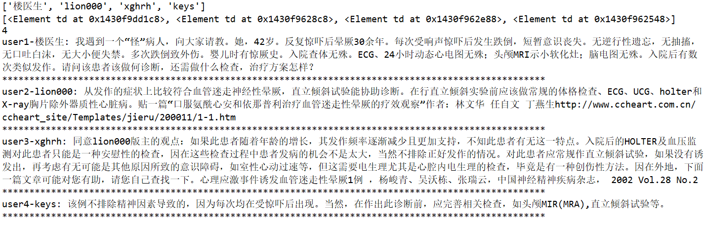 for i in range(0, len(user)):# 因为回复内容中有换行等标签,所以需要用string()来获取数据results.append(user[i].strip() + ": " + content[i].xpath('string(.)').strip())# 打印爬取的结果