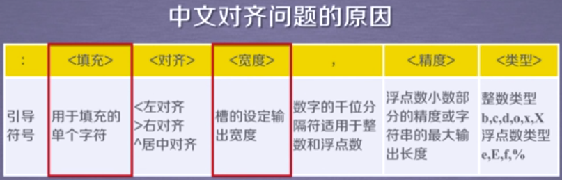 tplt.format("排名","学校名称", "省市", "score", "data",chr(12288)),其中{1:{5}^12}中1和5代表的时format中的第几个变量(从0开始计数),对齐符号^前{5}表示填充的内容即为中文空格chr(12288)。