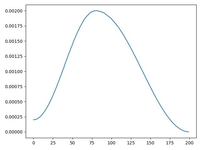 作者用的是adam onecycle,使用了下面的配置。由于我不想只训练200个epoch rpn阶段,想多训练一些周期,于是自己调整了训练周期,但是这样做训练一段时间之后,学习率还是在上升的,这样肯定是不行的,因为一般训练结束的时候学习率是很小的。