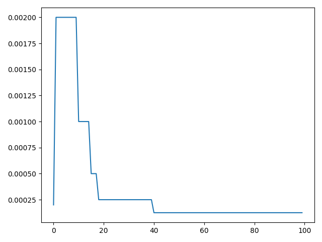 接下来我更改总的学习周期,更改DECAY_STEP_LIST等,看看学习率变化曲线是怎样的。