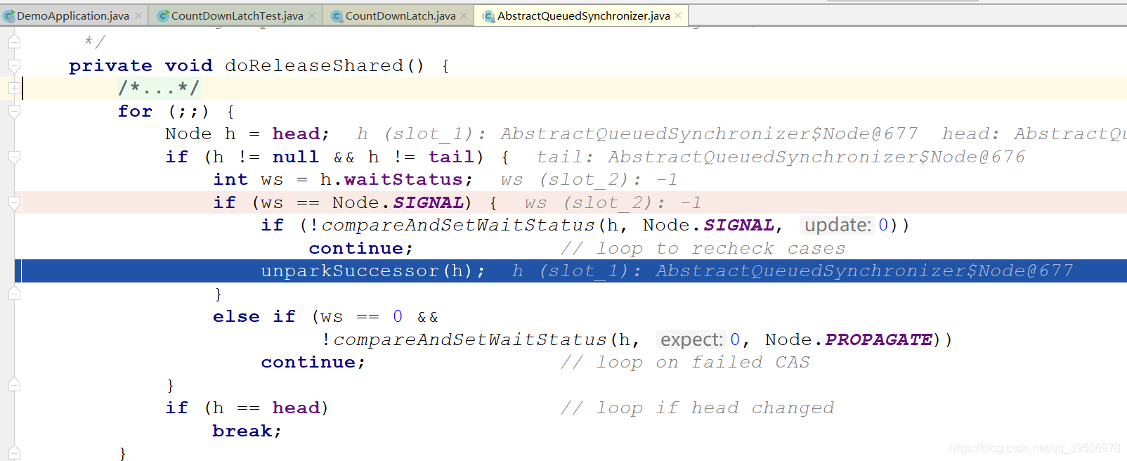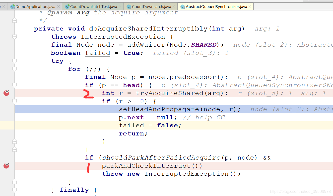 ②子线程countDownLatch.countDown(),每执行一次检查并修改AQS的state,state是否已countDown到0,如果到0则unparkSuccessor(h),里面调用LockSupport.unpark(s.thread),唤醒调用countDownLatch.await的主线程,主线程唤醒后继续上图的死循环,到“标记2”时tryAcquireShared会检查AQS的state并返回r=1退出死循环,然后执行主线程countDownLatch.await后面的逻辑