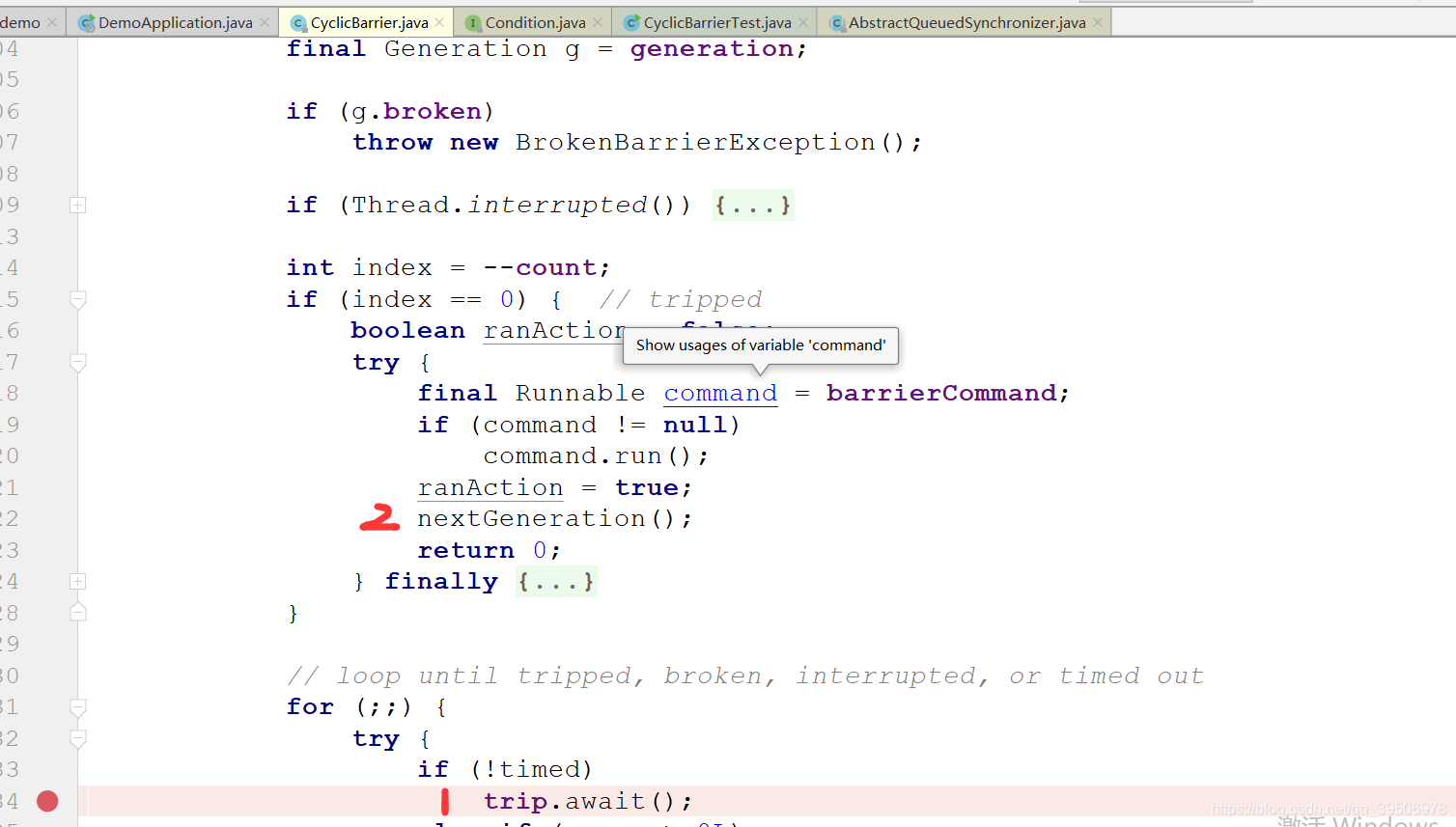 如果index=0則進入“標記2”,這之前如果cyclebarrier如果傳入了barrierAction會在這裏執行【最后一个线程到达之后栅栏触发(但在释放所有线程之前),该命令只在每个屏障点运行一次】。“標記2”nextGeneration()方法裏會執行trip.signalAll()喚醒柵欄上所有綫程並重置計數器count。