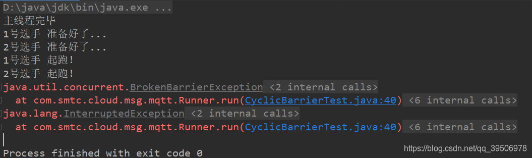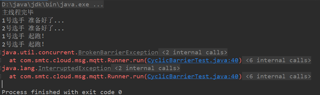 }class Runner implements Runnable {private CyclicBarrier barrier;private String name;public Runner(CyclicBarrier barrier, String name) {super();this.barrier = barrier;this.name = name;}@Overridepublic void run() {try {System.out.println(name + " 准备好了...");if (Thread.currentThread().getName().contains("2")){Thread.currentThread().interrupt();}barrier.await();} catch (Exception e) {e.printStackTrace();}System.out.println(name + " 起跑!");}