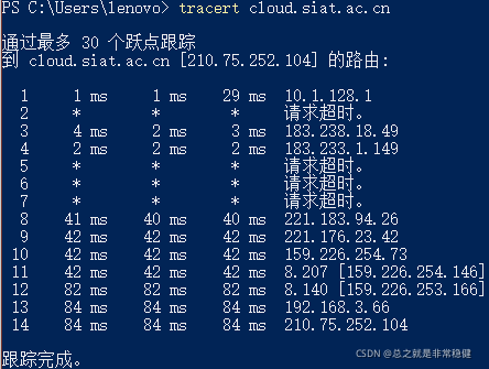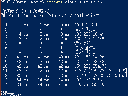 1.使用tracert 分析实验机器到 cloud.siat.ac.cn 的路由