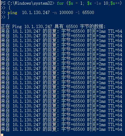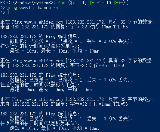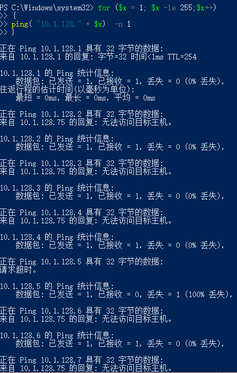 使用Power shell中的for循环在遍历全部的1 – 255的IP地址