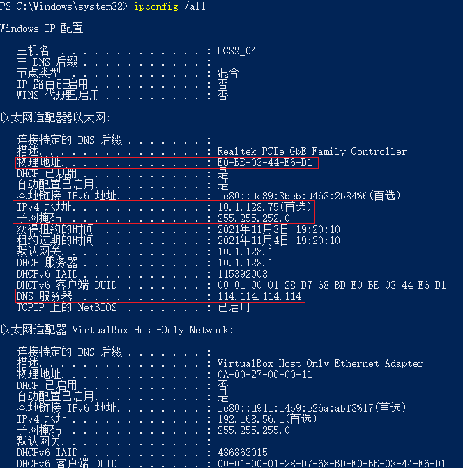 2.查看实验机器网卡的IPv4/IPv6地址、网关地址、子网掩码以及DNS