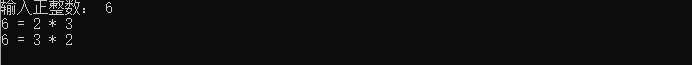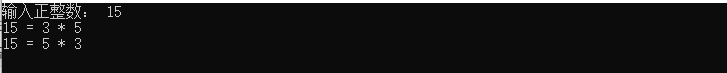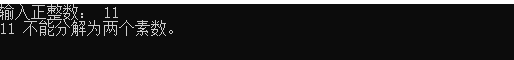 {// 计算一个数是两个素数之积int n,i,flag = 0;printf("输入正整数: ");scanf("%d",&n);for(i = 2; i <= n/2; ++i){// 检测判断if(isPrime(i) == 1){if(n % i == 0){// 可以将/改成你做需要的操作符if(isPrime(n / i) == 1){printf("%d = %d * %d\n",n,i,n / i);flag = 1;}}}}if(flag == 0){printf("%d 不能分解为两个素数。",n);}return 0;