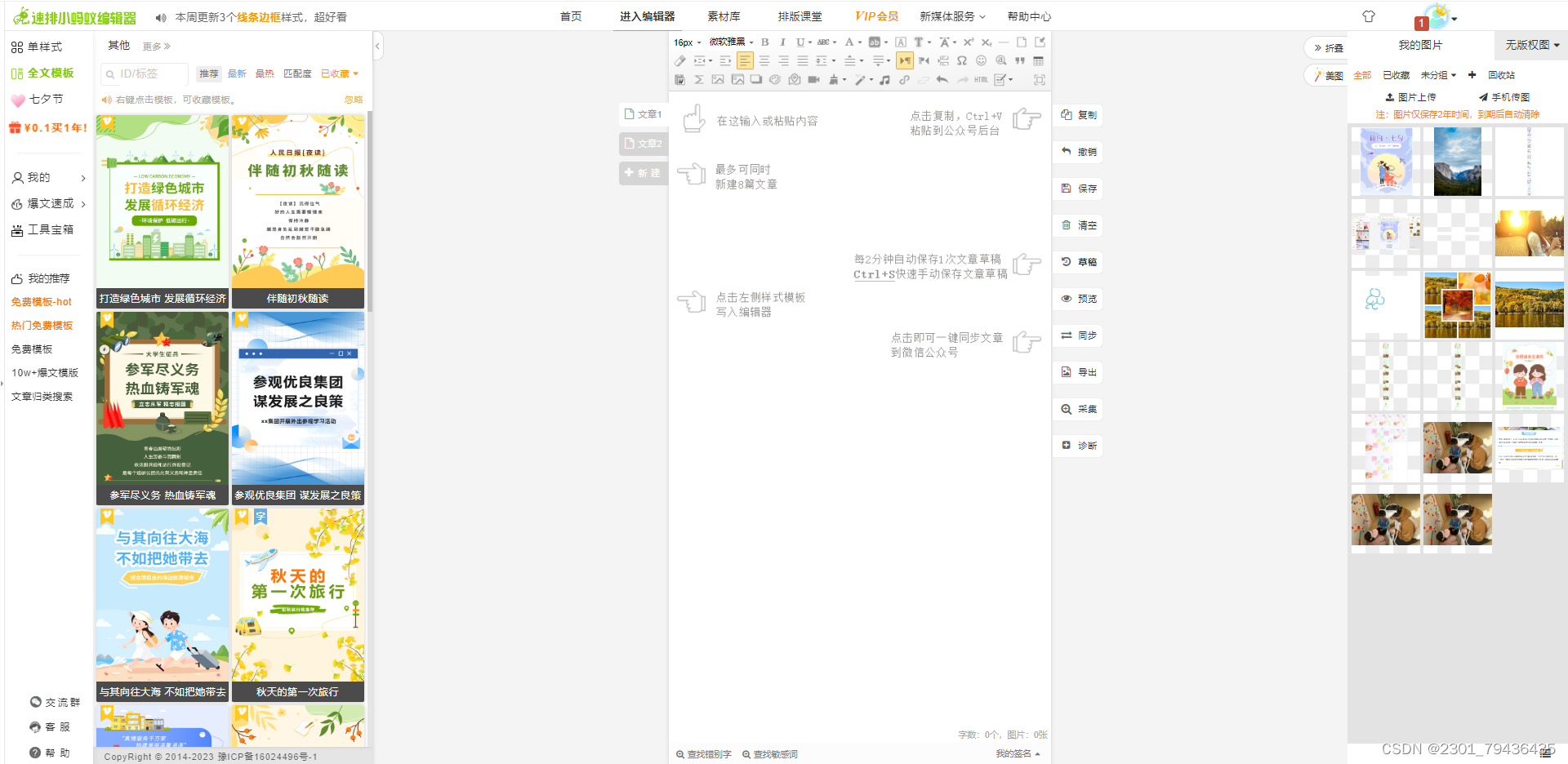 今天,我将向大家推荐一款优秀的公众号编辑器——速排小蚂蚁编辑器,它能够帮助你轻松打造精彩的推广软文!速排小蚂蚁编辑器具有简单易用的操作界面,即使是没有技术背景的人也能轻松上手。它提供了丰富的模板库,涵盖了各种不同风格的推广文案,无论是新闻报道、产品推介还是活动宣传,都能找到适合你的模板。同时,你还可以根据自己的需求进行灵活的编辑和排版,添加图片、音频、视频等多媒体元素,让推广软文更加丰富多彩。