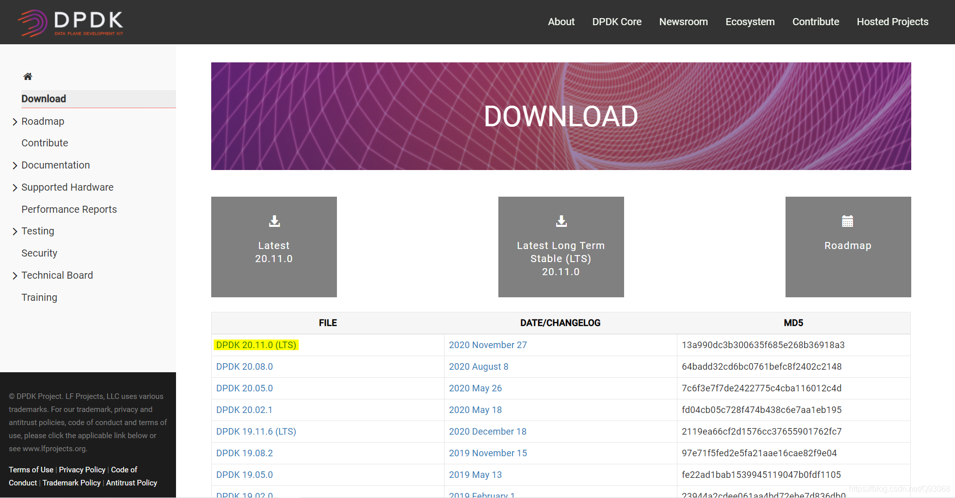 我下载的是 DPDK 20.11.0 (LTS) 版本,完成之后先解压:
