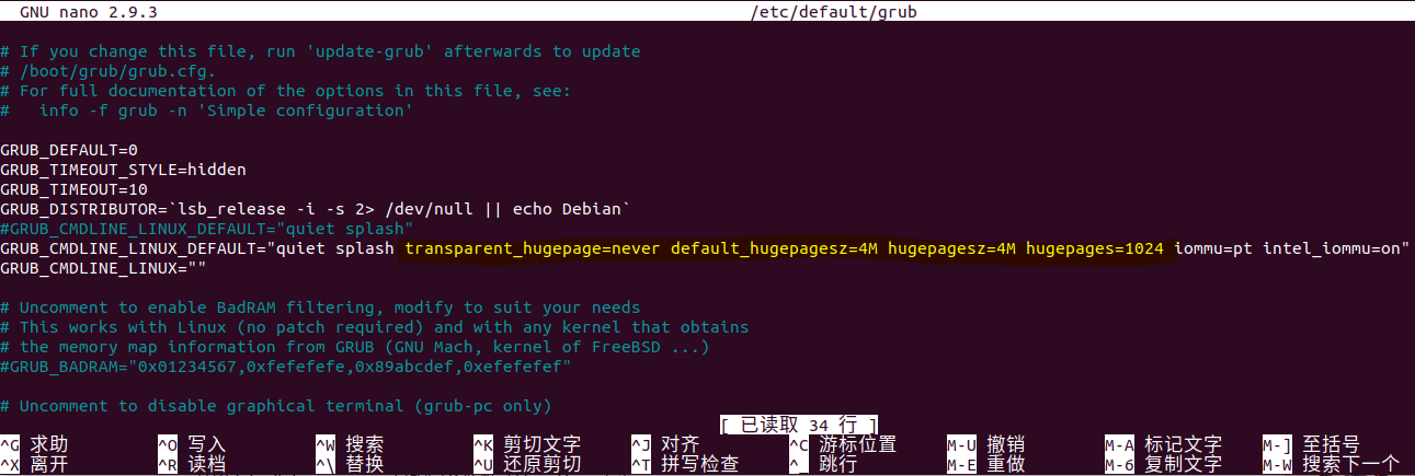 sudo nano /etc/default/grub// 在 GRUB_CMDLINE_LINUX_DEFAULT 中增加对 hugepage 的 size 和个数的设置