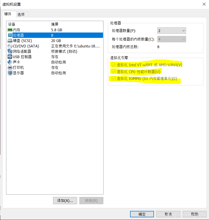我在开机时的那个 BIOS 界面找了半天没找到,最后发现可以直接在 VMware 里设置(要在虚拟机关机时进行),虚拟化引擎这里全勾上。