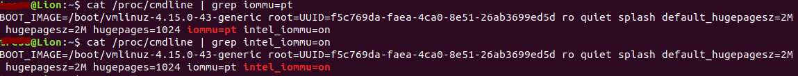cat /proc/cmdline | grep iommu=ptcat /proc/cmdline | grep intel_iommu=on