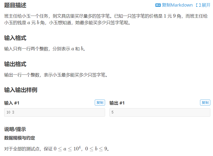 接下来我们来看一下今天的第二道题目——洛谷题单广场【入门1】顺序结构里面的倒数第二题 P1421 小玉买文具,这道题目和刚刚那道 P1425 小鱼的游泳时间有着异曲同工之妙,它同样也需要我们对输进来的数据进行转化,这样才能方便我们的计算,话不多说上题目👇