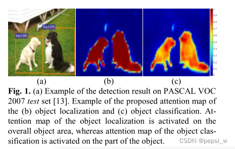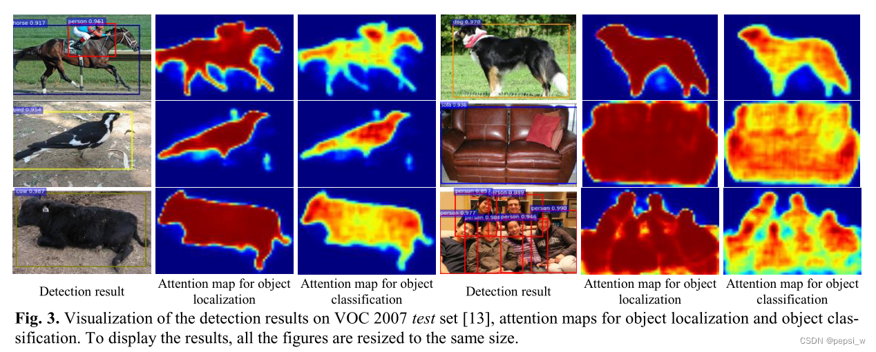 在最后一个共享层输出特征图后,部署两个注意力网络得到两种类型的特征图分别用于目标定位和目标分类。如下图所示,b部分是用于目标定位的注意力注意力图,c部分是用于目标分类的注意力图,可以看出前者更多的是注意于整个物体(与背景之间相区别),后者则是更加注意于物体内部的内容。