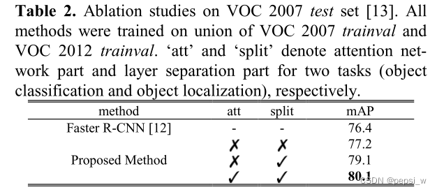 作者提出的方法性能为80.1 MAP,比以ResNet-101为主干的R-FCN高0.6MAP。通过生成注意力图以根据两个任务聚焦不同的区域并分离语义层,提高了对象检测性能。