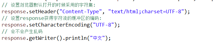 - 字符流是有缓冲区的,response获得字符流,response设计默认的缓冲区编码是ISO-8859-1。这个字符集不支持中文的。