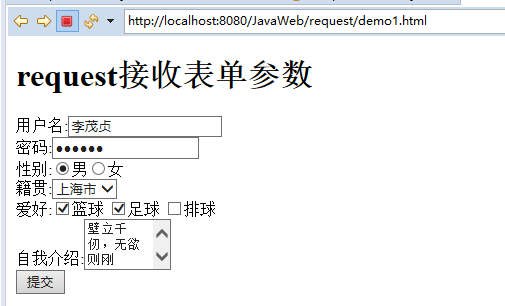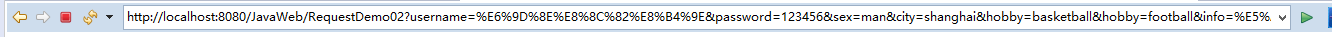 http://localhost:8080/JavaWeb/RequestDemo02?username=%E6%9D%8E%E8%8C%82%E8%B4%9E&password=123456&sex=man&city=shanghai&hobby=basketball&hobby=football&info=%E5%A3%81%E7%AB%8B%E5%8D%83%E4%BB%9E%EF%BC%8C%E6%97%A0%E6%AC%B2%E5%88%99%E5%88%9A/*