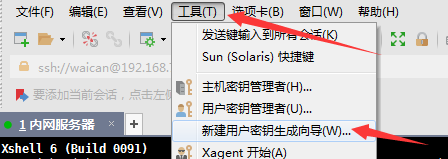 1,打开Xshell,点击工具(tool)-> 新建用户秘钥生成向导(User Key Generation Wizard...)