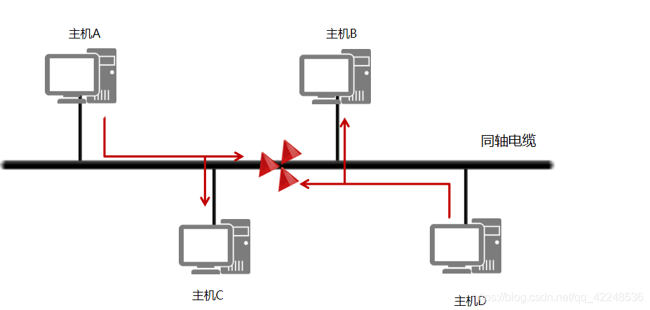 冲突严重:如图上,假设主机A要发送数据给主机B,不巧的是主机D也要发送数据给主机C,可见在传输的过程中,会出现碰撞的现象,即发生冲突。