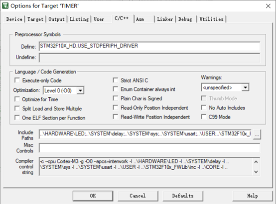 图中“STM32F10X_HD,USE_STDPERIPH_DRIVER “为所有文件均能识别的宏定义标志,其中我们很常见的是” STM32F10X_HD “,它代表的是大容量芯片。