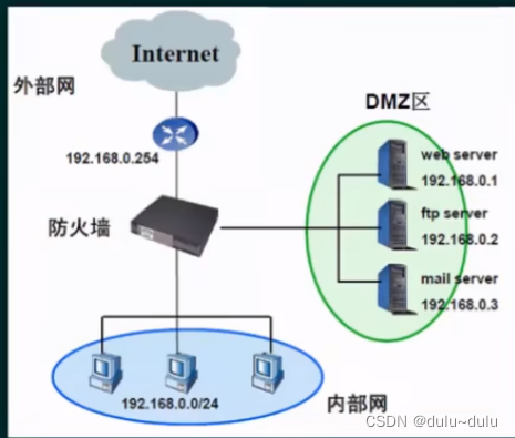 ③中间接口(DMZ) 连接对外开放服务器。