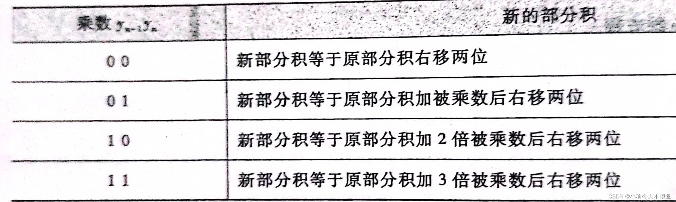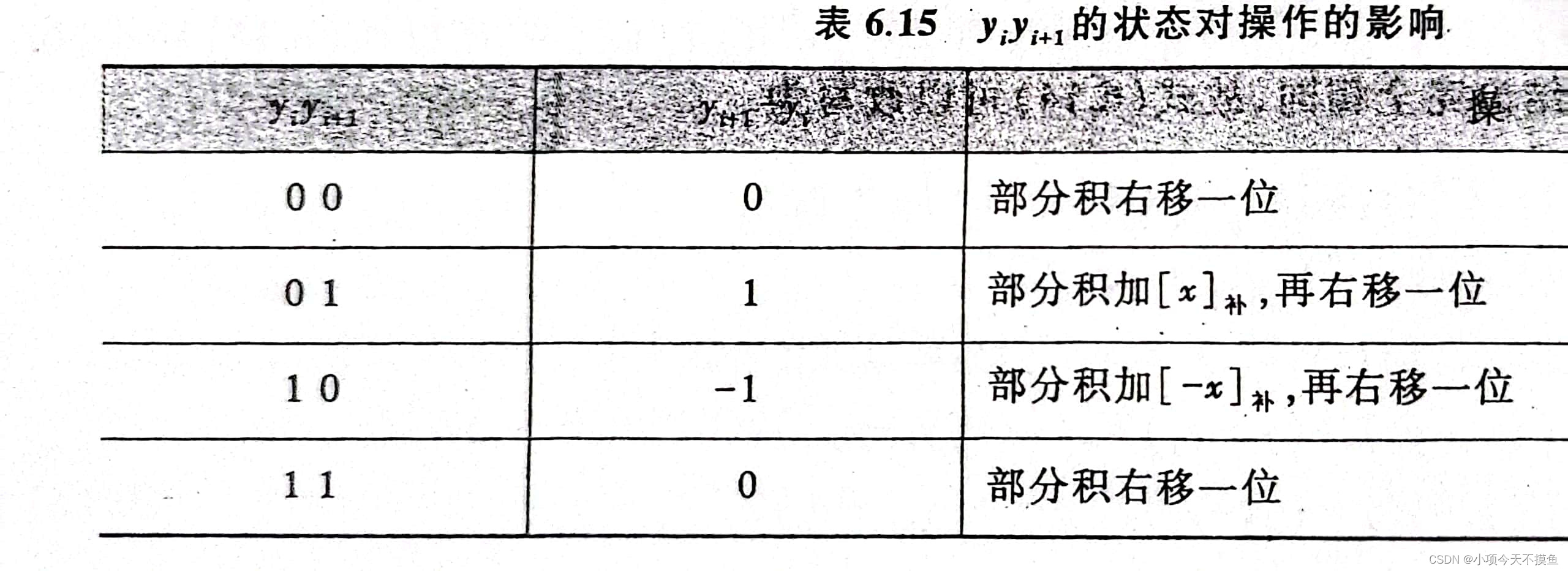 可以发现,开始时yn+1 = 0,部分积 = 0;每一步由(yi+1 - yi)确定部分积加上[x]补或[-x]补或0。由此重复n步,直到y1 - y0,但是这一步不移位。