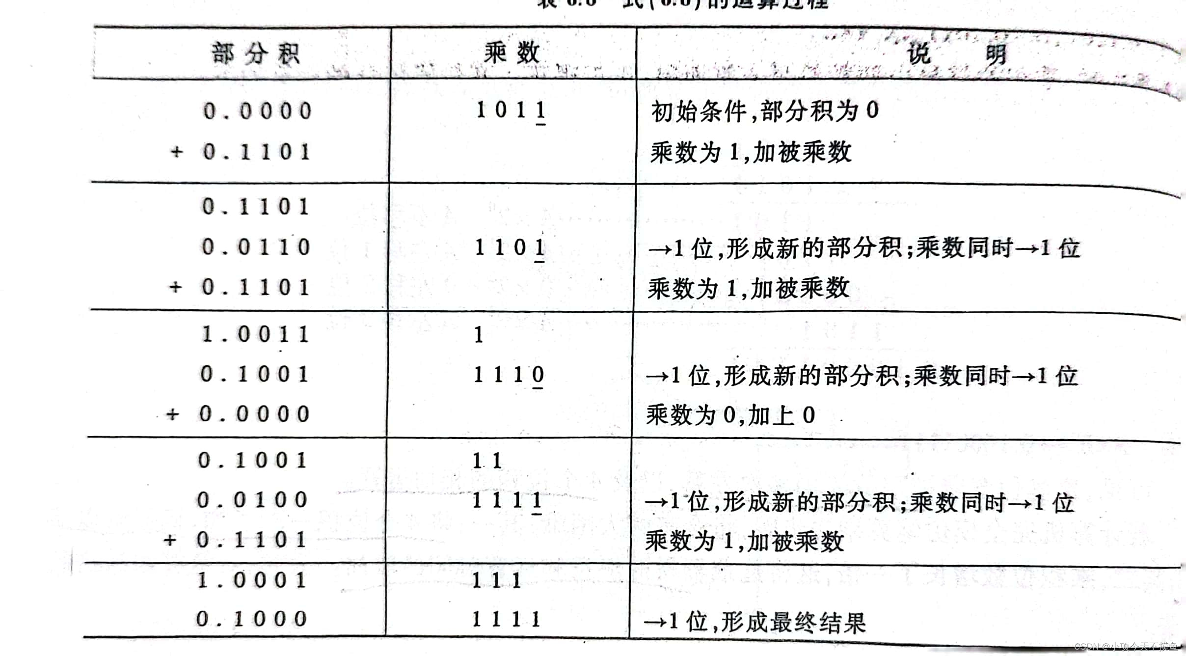 假定被乘数A = 0.1101, 乘数B = 0.1011。 我们根据上面的分析可以得到下面的步骤过程。