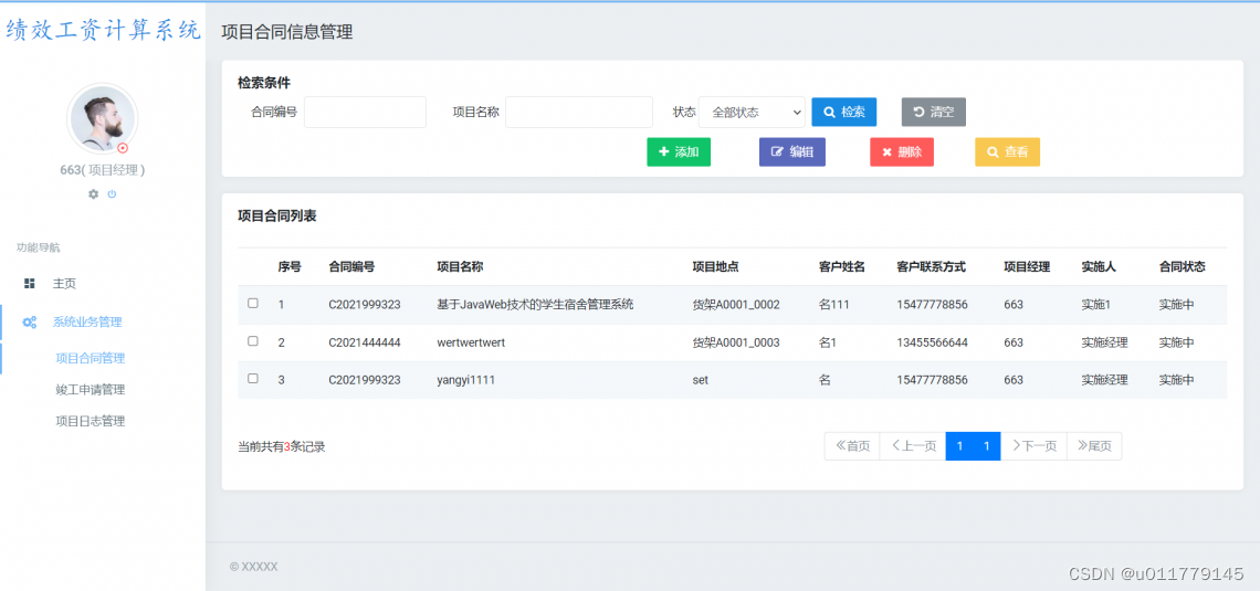 2.1 项目合同管理:添加项目合同信息, 编辑项目合同信息,派发项目合同,删除项目合同信息,查看项目合同详情,查询项目合同信息。
