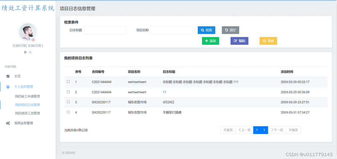 3.2 我的项目日志管理:实施人员和项目经理在我的项目日志模块当中,主要用于添加,修改,查看和检索功能,因为在一个项目被分配到对应人员后,项目将进行开发,而开发的过程中需要由实施人员将进度更新到项目日志列表中,方便项目经理以及后期的审核所使用,所以当实施人员和实施经理定时上传最新的项目日志后可以使用修改功能,还有查看详细功能,两位角色会从事多个项目或者有曾经完成过的项目,为了可以快速查看和定位当前的项目,就需要使用查询功能来进行快速定位。