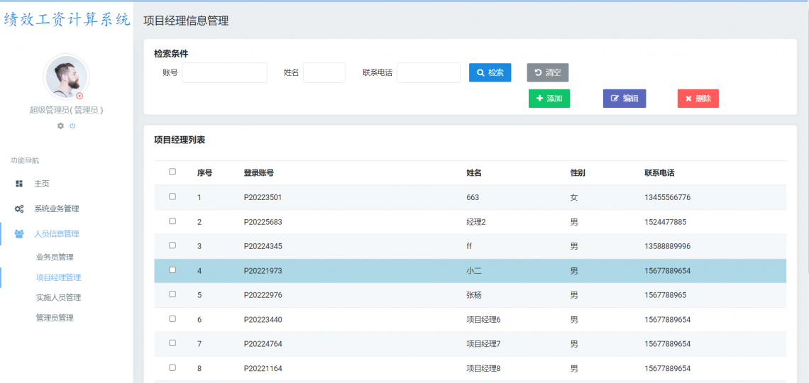 1.2 项目经理管理:项目经理模块也是由管理员进行管理,其中管理的字段与业务员相同,区别在于项目经理员工编号首字母是大写P字母,而对于这个模块当中主要也拥有的是4个功能,添加、修改、删除、查询这个功能,而项目经理由于在系统当中所管理的权限不同,所以会与业务员分开进行管理相关信息,因此项目经理与业务员是两个数据表进行管理的,分别为业务员信息表和项目经理信息表,其中在该模块项目经理的数据可以通过检索功能进行快速查找,查找后的信息也会直接展示在项目信息列表当中,通过列表可以直接快速的获取自己想要的相关信息。而获取自己信息之后,无论是想进行修改或者删除都是需要子啊管理员账号登录情况下才可以的。