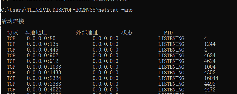2、输入命令:netstat -ano,列出所有端口的情况。
