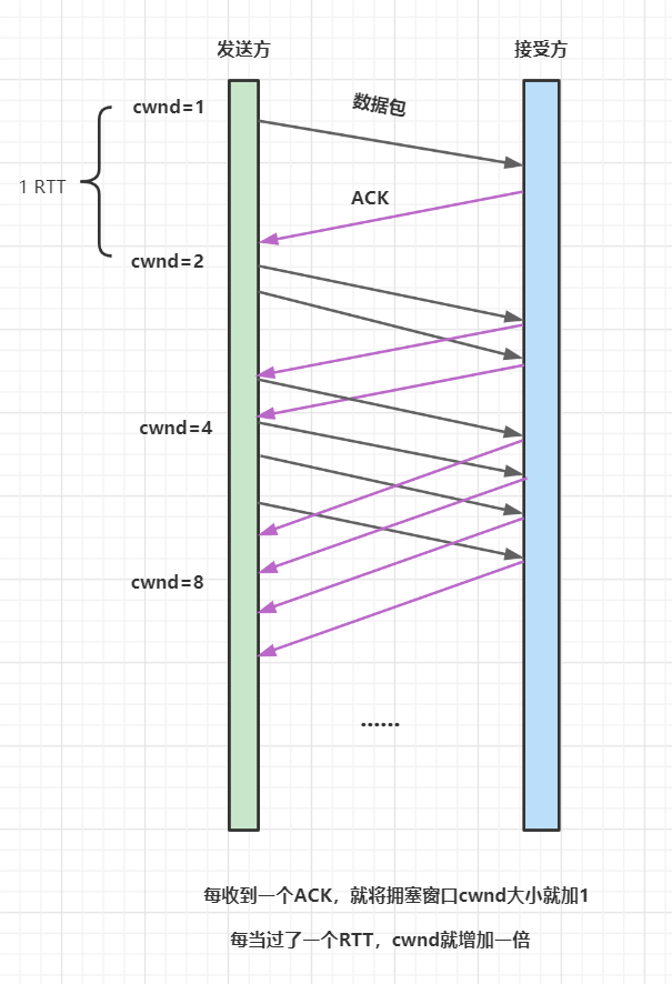 每当过了一个RTT,cwnd就增加一倍; 呈指数让升