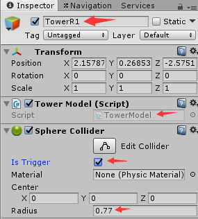 为炮塔创建脚本TowerModel 和 球形碰撞器SphereCollider并设置半径,并勾选Is Trigger触发器