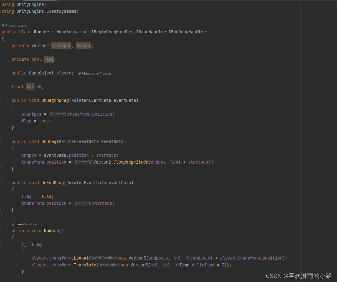 两个Vector2的变量 startpos红色image的初始位置也就是摇杆的中心点,enpos拖拽红色image的位置,bool值flag是为了触发摇杆,player就是你要控制的物体,玩家。