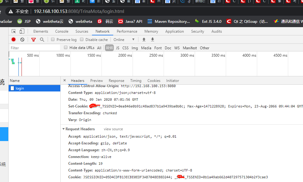 @CrossOrigin@RequestMapping(value="/login", produces = "application/json; charset=utf-8", method=RequestMethod.POST)@ApiOperation(value = "用户登录")@ApiImplicitParams({@ApiImplicitParam(name = "name", value = "用户名", required = true, dataType = "string"),@ApiImplicitParam(name = "pwd", value = "密码", required = true, dataType = "string")})@ApiResponses({@ApiResponse(code = 200, message = "result", response = result.class)})public Object login(HttpServletRequest request,HttpServletResponse response,@RequestParam(value="name")String name,@RequestParam(value="pwd")String pwd) {System.out.println("login:");//1.验证result ret = new result(200, "登录成功", 0, tutil.currMSecs(), null);//略//response.setHeader("Access-Control-Allow-Credentials", "true");response.setHeader("Access-Control-Allow-Origin", request.getHeader("Origin"));String sSessionId = UUID.randomUUID().toString().replaceAll("-", "");;Cookie ck = new Cookie(sdpt.SEN_ID, sSessionId);ck.setPath("/");ck.setMaxAge(30*1000*60);response.addCookie(ck);HttpSession session = request.getSession();session.setAttribute(sdpt.SEN_ID, sSessionId);return ret;}