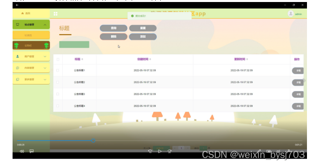 本论文系统地描绘了整个智慧社区APP,主要实现的功能有以下几点:首页、站点管理(轮播图、公告栏)、用户管理(管理员、社区用户)、内容管理(社区论坛、论坛分类、社区资讯、资讯分类)、更多管理(费用缴纳、意见反馈、物业报修)等功能,系统中管理员主要是为了安全有效地存储和管理各类信息,还可以对系统进行管理与更新维护等操作,并且对后台有相应的操作权限。