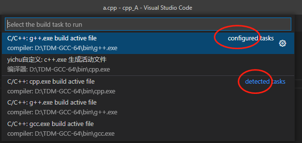 光标悬停某一项, 右上角会有 齿轮 标志, 单击后会自动在工作目录中新建 .vscode/tasks.json, label 即为选项卡中的名字, 可以自定义. 然后选项卡中会多出 configured tasks.