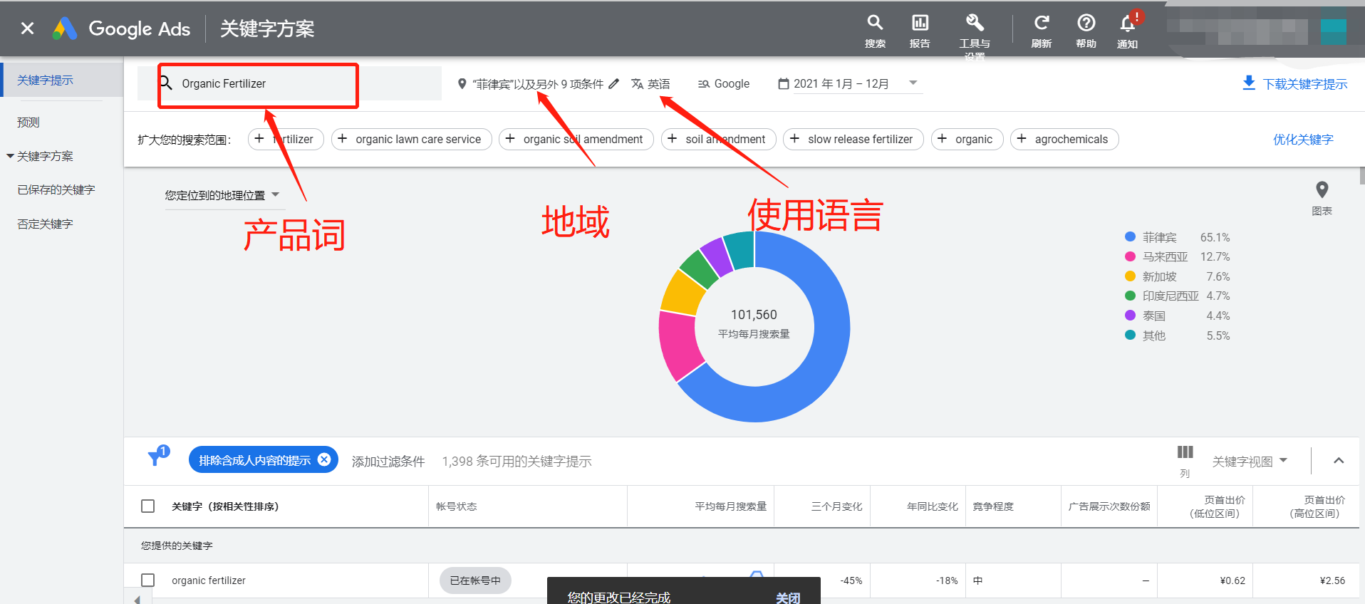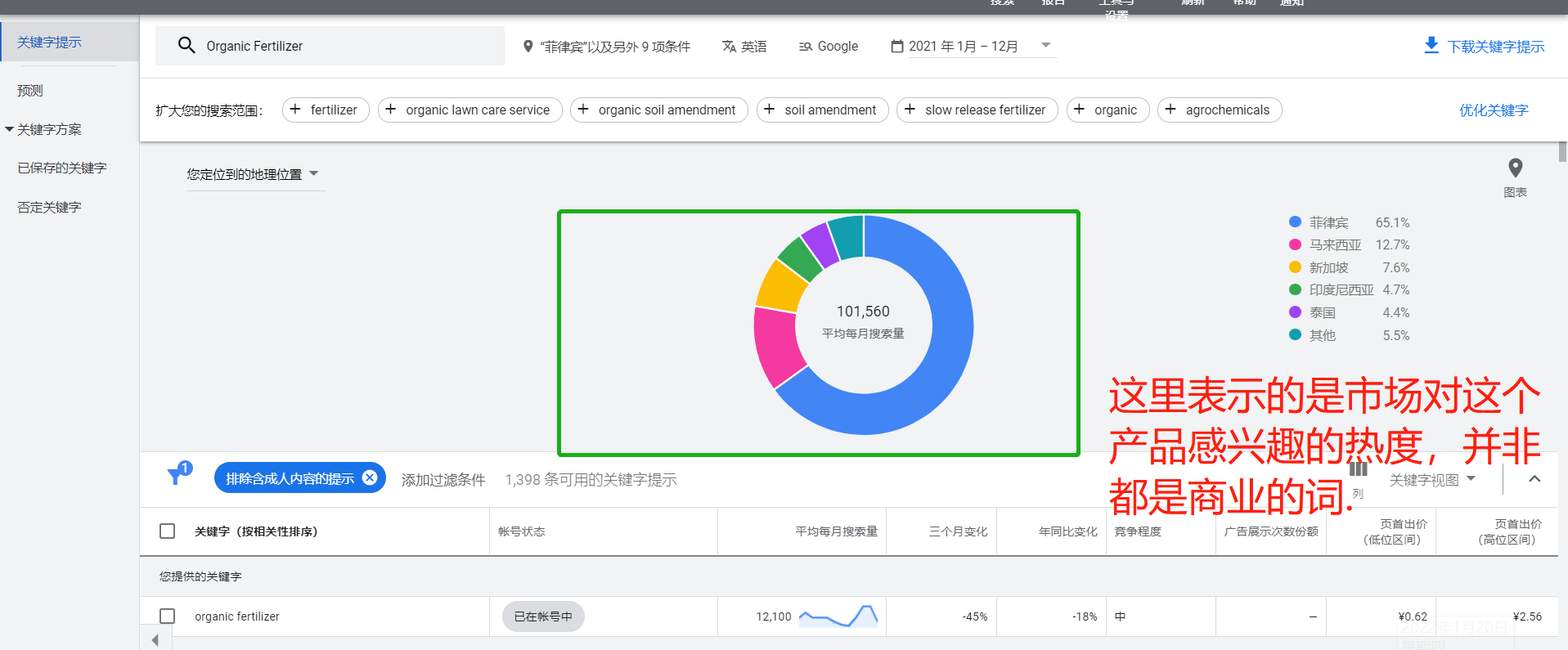 看第一地区是否有需求、它的热度,我们要去看这个地区的市场搜索量。用Google keywords查询。