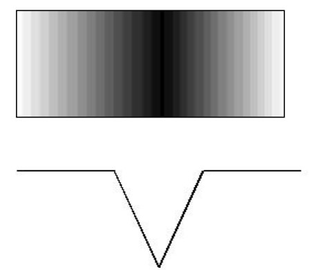 边缘模型主要分为台阶边缘模型、斜坡边缘模型和屋顶边缘模型。台阶边缘模型指的是在1个像素的距离上发生两个灰度级间理想的过渡(后续的Canny边缘检测算法中就采用该边缘模型进行推导),即这两个灰度级过渡时存在一条较为明显的分界线,如下图所示: