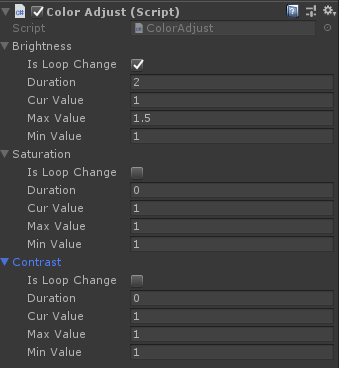 {public ColorAdjustShaderData Brightness; //调整亮度public ColorAdjustShaderData Saturation;//调整饱和度public ColorAdjustShaderData Contrast; //调整对比度private MaskableGraphic maskableGraphic;void Awake(){maskableGraphic = GetComponent();if (maskableGraphic){Image image = maskableGraphic as Image;if (image){image.material = new Material(Shader.Find("Custom/ColorAdjustEffect"));}}if (Brightness.IsLoopChange){DOTween.To(x => Brightness.CurValue = x, Brightness.MinValue, Brightness.MaxValue, Brightness.Duration).SetLoops(-1,LoopType.Yoyo);}if (Saturation.IsLoopChange){DOTween.To(x => Saturation.CurValue = x, Saturation.MinValue, Saturation.MaxValue, Saturation.Duration).SetLoops(-1, LoopType.Yoyo);}if (Contrast.IsLoopChange){DOTween.To(x => Contrast.CurValue = x, Contrast.MinValue, Contrast.MaxValue, Contrast.Duration).SetLoops(-1, LoopType.Yoyo);}}void Update(){if (Brightness.IsLoopChange){maskableGraphic.material.SetFloat("_Brightness", Brightness.CurValue);}if (Saturation.IsLoopChange){maskableGraphic.material.SetFloat("_Saturation", Brightness.CurValue);}if (Contrast.IsLoopChange){maskableGraphic.material.SetFloat("_Contrast", Brightness.CurValue);}}void Start(){SetShader();}public void SetShader(){maskableGraphic.material.SetFloat("_Brightness", Brightness.CurValue);maskableGraphic.material.SetFloat("_Saturation", Saturation.CurValue);maskableGraphic.material.SetFloat("_Contrast", Contrast.CurValue);}